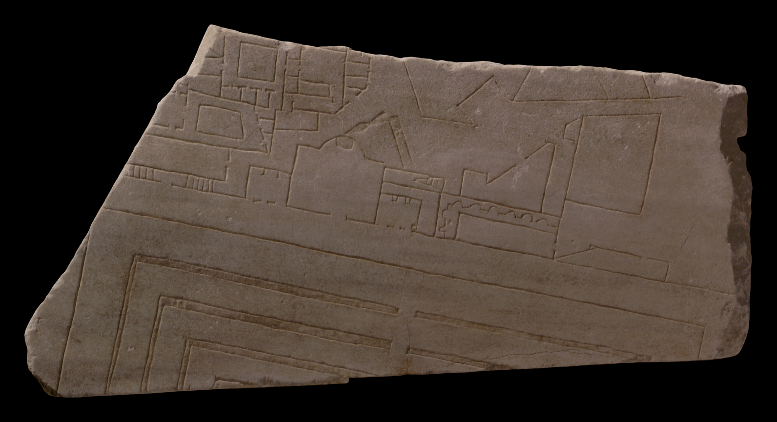 The lower part of the fragment is separated from the upper by a single line demarcating a rectangular boundary wall. Two of its corners are visible. Inside this boundary, a series of thick, parallel lines cross the available space; they are recessed and were originally filled with red paint for heightened visibility. A narrow passage--marked out for the carvers by faint guidelines--separates these thick lines into two sets. The thick lines on the left turn a corner to remain parallel with the boundary wall.