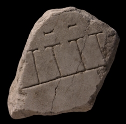 | Description A row of tabernae traverses the fragment on a diagonal angle. The shops are fronted by an arcade and seem to back onto an open space.