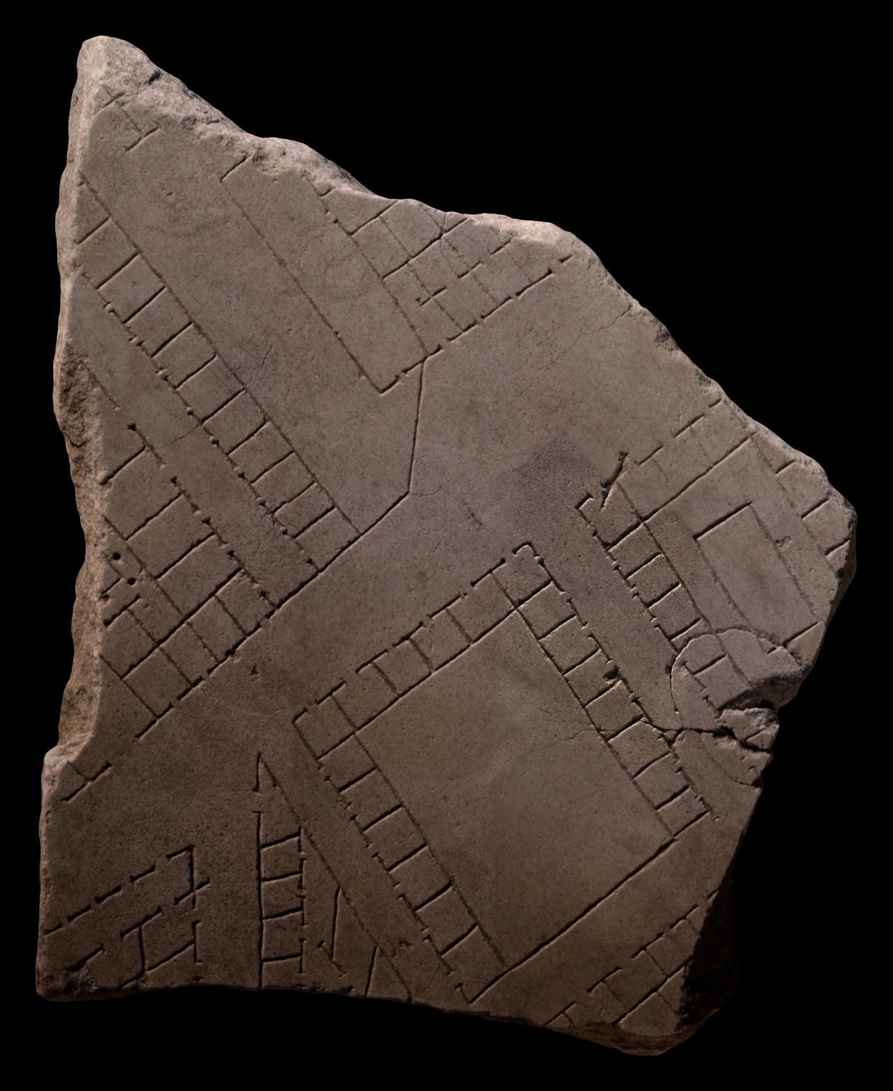 Significance This fragment is typical of non-identified fragments of the Plan. No monumental buildings are represented, and the fragment instead provides a view of the lesser known structures that made up the urban fabric of Rome: the residential and commercial buildings. The strong skewing of the architecture in the bottom left corner, in contrast to the rectilinearity of the rest of the fragment, was probably caused when the Roman map makers mosaicked together the surveys of different sections of the city. |