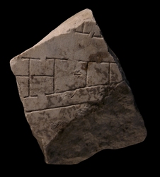 | Description The fragment was part of a slab edge. A street traverses the piece from center left to top right. It continues along the bottom of the joining fr. 563a. The street is flanked at top by what seems to be a row of tabernae. Also below it is framed by a row of shops, those on the left being back-to-back tabernae. A straight line runs parallel to the back wall of this bottom row of shops. It might represent the edge of a sidewalk.