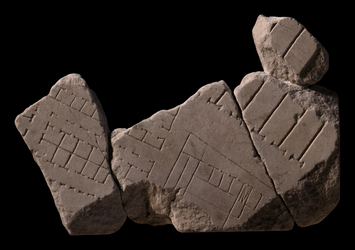 | Description The four joined fragments formed the corner of a slab. On the left side of the group, an isolated row of back-to-back tabernae is flanked on the right, and perhaps on the left, by a covered arcade. On the far left, more shops face this row and yet another row of shops is located to the right, parallel to the back-to-back tabernae. These last shops face some unidentifiable structure across a narrow corridor. The buildings on the left side of the fragment are separated from those on the right by a street. This street makes a right turn and thus separates the two buildings visible on the right. The building at the bottom right seems to be walled in completely. The "wall" in front may, however, represent the edge of a sidewalk as opposed to a tall wall. A row of shops faces right and up, and these shops back onto one long room. The bottom shop within this sequence contains a staircase. Other long, narrow rooms are located in the left side of the building. The top right part of this fragment group is occupied by a series of long, narrow rooms with openings facing the wide street below. Partial doorway opening incisions barely visible on the extreme edge of 564a seem to suggest two rows of back-to-back rooms, with their common wall no longer visible along the fractured boundary between 564a and 564b.The lines that depict these rooms are deeper than anywhere else in the fragment group.