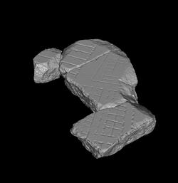 The back surface of the fragment cluster is generally smooth, although there is an unusual 11 centimeter wide rough strip along the longer slab edge. E. Rodríguez-Almeida notes that the marble fractures along the sides of subfragment 564d and between subfragments 564b and 564c occur in line with the marble veining (AG 1980, p. 13 and fig. 3).
