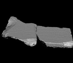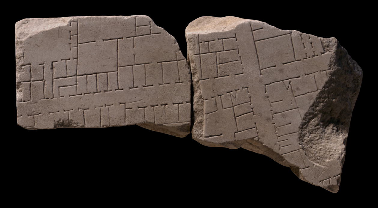 Two joined fragments, 574a is the lower right corner of slab and has two original edges. 574b joins 574a on the left.