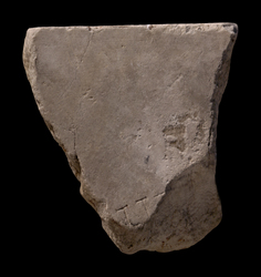 | Description The fragment formed a large part of a slab edge; a clamp hole is visible. Most of the surface of the fragment is blank; only at the bottom is a small section of a row of tabernae visible.