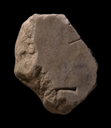 | Description At the bottom left edge of the fragment, the top right part of a large letter is visible. The letter is deeply cut, with the serif clearly delineated. Along the top right edge of the piece, the end of a line can be seen.