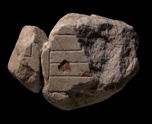 | Description The joined fragments depict on the right a series of parallel, horizontal lines. The distance between the lines is almost the same in all cases. They are bordered on the left by a straight, vertical line that traverses the larger fragment. Top left, the corner of another feature is barely visible.