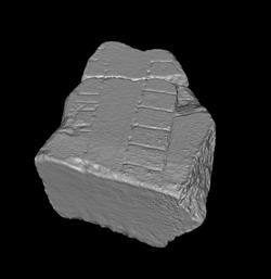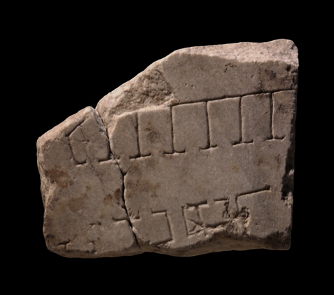 | Description The fragment was part of a slab edge. At top lies an almost horizontal row of tabernae. The shops face downwards. The back corner of the shop furthest left has been cut off, perhaps to accommodate other architecture. A straight line emerges from the back of the row of shops at an oblique angle towards the top edge of the fragment. Below the tabernae, across a passageway, lies another structure, only partially visible. The rooms that face it are poorly engraved. They all seem to open onto the passageway. One, in the center, may not be a room but an entry to the rest of the building below the frontal rooms. A staircase is visible in the section to the right of this entry. This building seems to make a slight curve downwards toward the left.