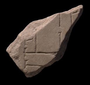 | Description The fragment depicts a section of a building. Part of the edge of the structure is visible on the left. Here, a series of rooms faces left, away from the building, the two upper, interconnected rooms being smaller and shorter than the two bottom rooms. Top center, a larger, rectangular space gives access to smaller rooms on the right.