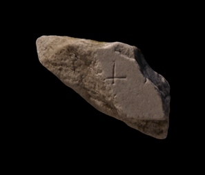 | Description The tiny fragment shows two short dashes, crossed. Part of what may be another cross is visible to the far right. A straight, horizontal line, parallel to the horizontal bars of the crosses is barely visible along the bottom edge of the fragment.