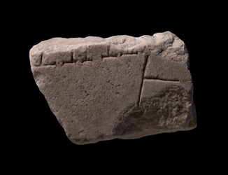 | Description At top lies a horizontal row of small rooms. They seem to be of unequal width. They join a straight line that traverses the fragment from the top right corner downwards. Another wall is connected to the right side of this straight wall. The corner created by the row of rooms at top and the straight line is open space.