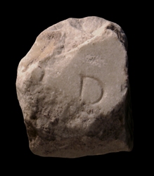| Description The small fragment depicts parts of two or three letters. The central letter has been identified as a P and the letter to the left of it as an I (PM 1960, p. 154). In the color photograph, however, the letter to the left of the P looks more like another P or perhaps a B (if it IS a letter and not some other feature), while the tiny section of a crossbar of a letter to the right looks like a T more than an I.