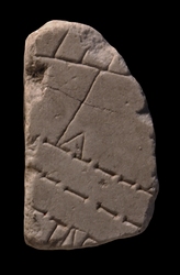 | Description The fragment was part of a slab edge. Two rows of arcades traverse the fragment on a diagonal. In the bottom left corner, a tiny section of a row of rooms, parallel to the arcades, is visible. A staircase suggests the building is multi-storeyed. The top arcade seems to function as the front for two large enclosures, one of which contains a staircase. Behind these enclosures are additional rooms in a row.