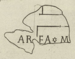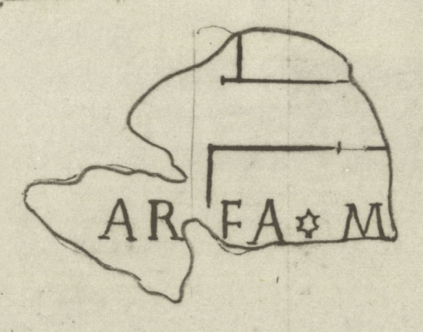| Description The fragments themselves are missing but Renaissance drawing Cod. Vat. Lat. 3439 - Fo 19r shows them as they looked upon discovery when they were still in one piece with fr. 674b (see detailed photo above or PM 1960, pl. 9, no. 3). An inscription, AREA*M[---] traversed the bottom of the fragment. Here it ran across the lower of two parallel, horizontal enclosures in the upper right side of the fragment. A vertical wall with a curved line at top that joined it to the top enclosure, was drawn with a very faint line on the left. This vertical line crossed the inscription between the R and the E.