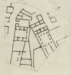| Description The fragment is missing but Renaissance drawing Cod. Vat. Lat. 3439 - Fo 19r shows what it depicted (see detailed photo above or PM 1960, pl. 9, no. 10). A vertical street traversed the fragment on the left side. A few rooms were visible to the left of this street. On its right were five adjoining buildings, four of which opened onto the street. The building at the bottom did not face the street. It consisted of a row of shops with an arcade in front and what seemed to be a closed corridor. Could it, however, be a wide sidewalk? Abutting the top of this structure was a large, square room that opened onto the street via a tiny opening. Adjoining this room at top was a square building that consisted of a central space surrounded by six rooms, all facing the center. The room in the back spanned the width of the entire building. Above it was a rectangular room with two small shops flanking the central entrance. In the rear, an opening led to a back alley that branched off to the right and to the vertical street on the left. A small structure, consisting of a back room and two front rooms, was wedged between the rectangular building and the left branch of the back alley. Behind this series of buildings were two large open spaces of irregular shape and yet another series of buildings. The building at top, a large room surrounded by seven smaller, inward-facing rooms, opened onto a small street on the far right. Across the street, a row of left-facing shops was cut off by the right turn of the street. In the bottom right corner of the fragment, a large peristyle building abutted the building above. The peristyle was closed on three sides; on the fourth side, it opened towards three elongated rooms. Another large, open structure was visible to the right of the peristyle building.