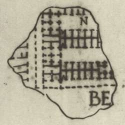 | Description The fragment itself is lost but Renaissance drawing Cod. Vat. Lat. 3439 - Fo 22r shows what it depicted (see photo detail above or PM 1960, pl. 13, no. 30). A large building, consisting of two rectangular courtyards surrounded by small inward- and outward-facing rooms, occupied most of the fragment. Narrow double entrances on the left side and in the bottom rows of rooms allowed access to the two courtyards. Within the entrances on the left were staircases to upper floors. The entire building was fronted by an arcade. To the left, a row of shops(?) faced the courtyard building. The letter N was visible in the space of the upper courtyard; larger letters BE appeared below the building.