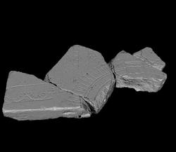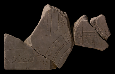 Description Fragment 7a, at left, is the lower left corner of the slab. There is a clamp hole along the left edge. This fragment's surface is almost entirely taken up by a single monument that continues beyond the fragment's left edge onto the adjacent slab (now lost). The surviving part of the structure consists of two semi-circular bays with a flat rear wall and an L-shaped anta, at the right end. Unusually, this entire outline is recessed and would have been filled with highly visible red paint. A line of dots representing columns follows the outline of the curves and the anta. Inside the left semi-circle is a small square, also recessed, perhaps a statue pedestal. Some distance in front is a horizontal line.