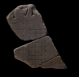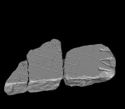| Description This group consists of three fragments from the same slab, from top to bottom: 8b, d, and 8e. The bottom of three letters, IVM, from a horizontal inscription appears at top. Just below the letters, a very thin vein traverses the marble. This vein is the continuation of the one visible in fr. 8a and 8c. Below the inscription, three vertical groups of buildings are separated by two streets. On the left, large rooms open onto the space above and the adjacent street on the right. Across the street lies a parallel row of back-to-back tabernae. They are fronted on the right side by a covered arcade, denoted by a dashed line. Beyond that, a wide street separates the back-to-back tabernae from a barely visible structure at the right edge of these fragments. The facade of this structure consists of an arcade (the T-shapes suggest it was vaulted) behind which lay another row of small rooms.
