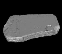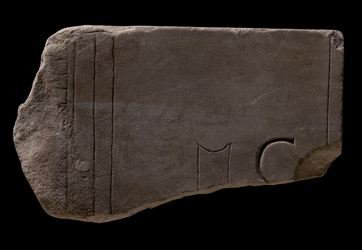 | Description This large fragment formed the upper right corner of a slab. Clamp holes are still visible in three places on the back: one on top and two on the right edge. The left side of the piece is much deteriorated. Four straight, parallel lines traverse the piece on the left, and another parallel line runs along the right edge. Centered between these lines are two more parallel lines, closely spaced and linked at the top by a short curve. Immediately to the right of this central feature is a large C.