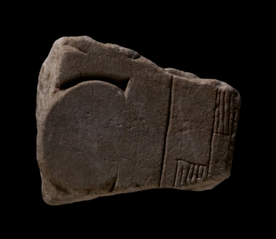 | Description The fragment was part of a slab edge; a clamp hole is visible on the side. A large inscribed C takes up roughly half of the surface area. Above, traces of the legs of another letter are visible. To the right, two straight, vertical lines traverse the fragment. A third line, parallel to these two, perhaps runs very close along the edge. Between them, two separate staircases are represented by sets of short, parallel lines.