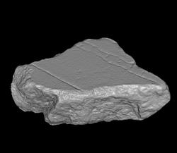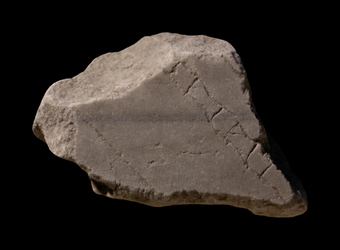 | Description An aqueduct traverses the fragment from top center to bottom right. It is rendered as a string of alternating concave and convex sections. On either side, a straight line runs parallel to the aqueduct; the line on the right is closer to the water channel than the one on the left. A dark blue veining line crosses the fragment at a 45 degree angle to the aqueduct.