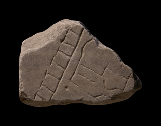 | Description The fragment was part of a slab edge. A single row of tabernae, facing left, crosses the fragment from top center to the bottom left corner. In the open space behind the shops lies a partially visible building. One of its external walls - the one that faces the back of the shops - is arched. Two internal arches face each other and create an hourglass-shaped room between them that extends into two elongated rooms. A larger hall is situated behind the external arch. A single dot by the lower left corner of the building may represent a column.