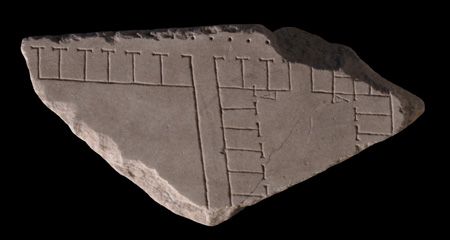 | Description The top edge of this fragment is a slab border with a clamp hole. Two buildings lie side by side, separated by a vertical street. A continuous, covered portico runs along the top side. The structure on the left consists of a large courtyard fronted by a row of outward-facing tabernae. Close examination of the incisions shows that the back wall of the row of tabernae stops short of the left fragment edge, indicating an entrance to the courtyard. Interior rooms frame the left and right edges of the central space on the right half of the fragment. Like the open structure to the left, this building is fronted on the top by outward-facing tabernae. Two stairways, rendered as triangles, flank the wide, central entrance to the interior.